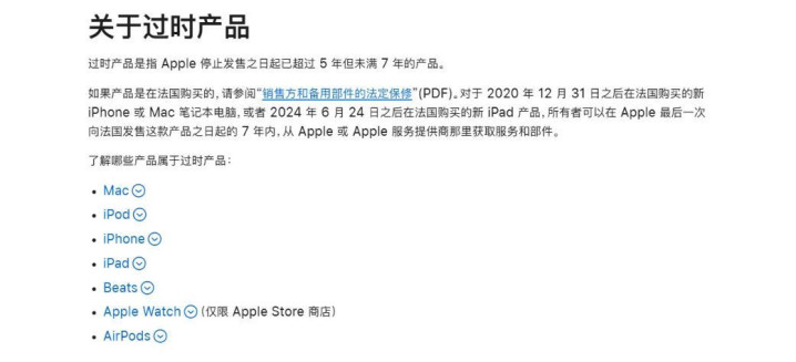 过时产品 : 指的是停止销售超过 5 年但未满 7 年的产品,处于此阶段的设备,只要苹果官方还有库存零件,用户依然可以申请维修服务。 然而,这并非一项“保证性”服务——一旦特定零件库存耗尽,官方将不再提供支持。